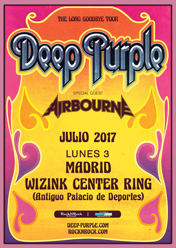 La banda de hard rock australiana acompañará a Deep Purple en su concierto de Madrid. Deep Purple y Airbourne actuarán el 3 de julio en el Wizink Center ( Antiguo Palacio de Deportes) de Madrid.